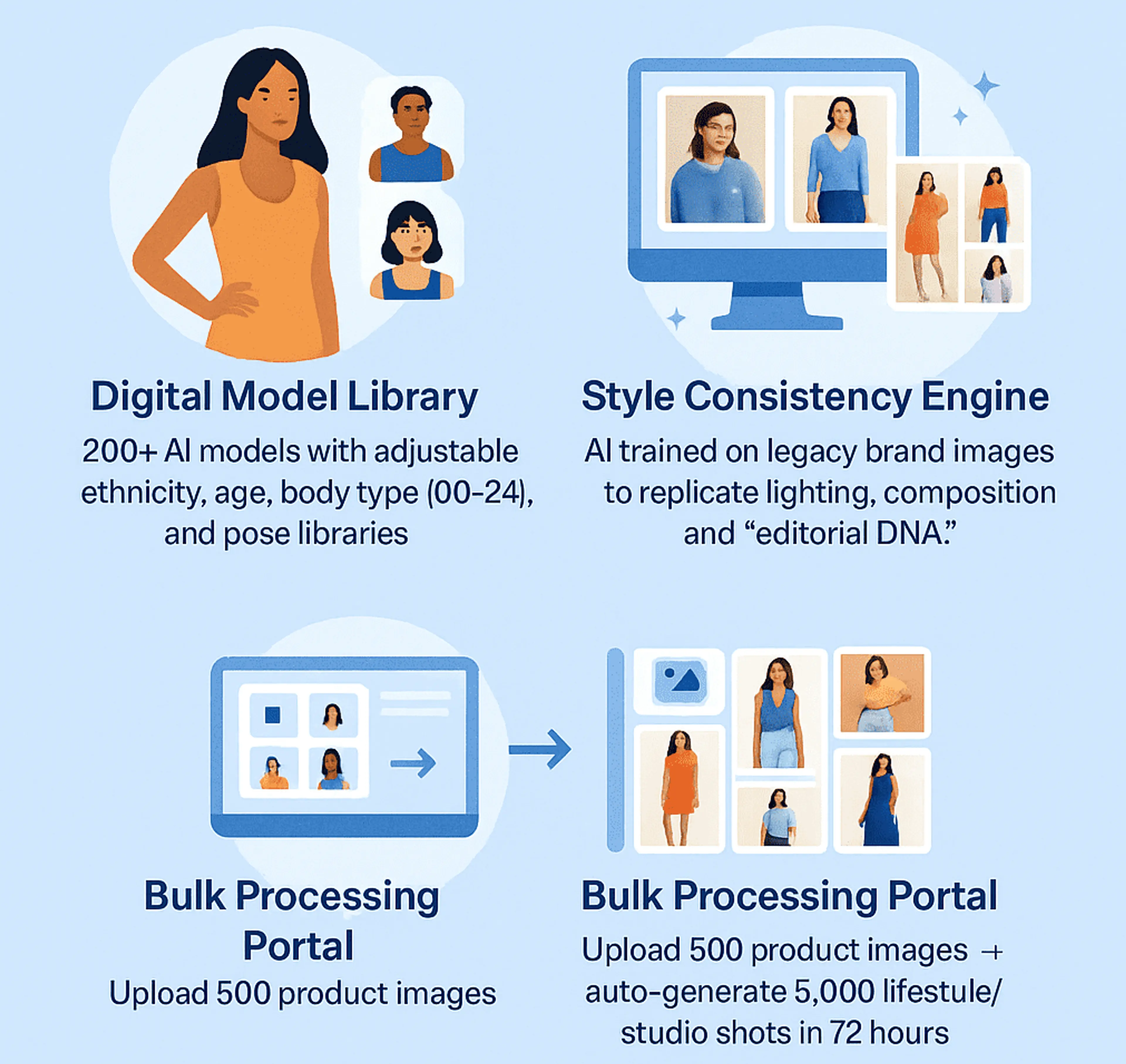 A bulk processing portal allows brands to upload 500 product images and auto-generate 5,000 lifestyle shots in just 72 hours. This dramatic improvement in speed allows fashion brands to launch new collections within days, as opposed to weeks or months.