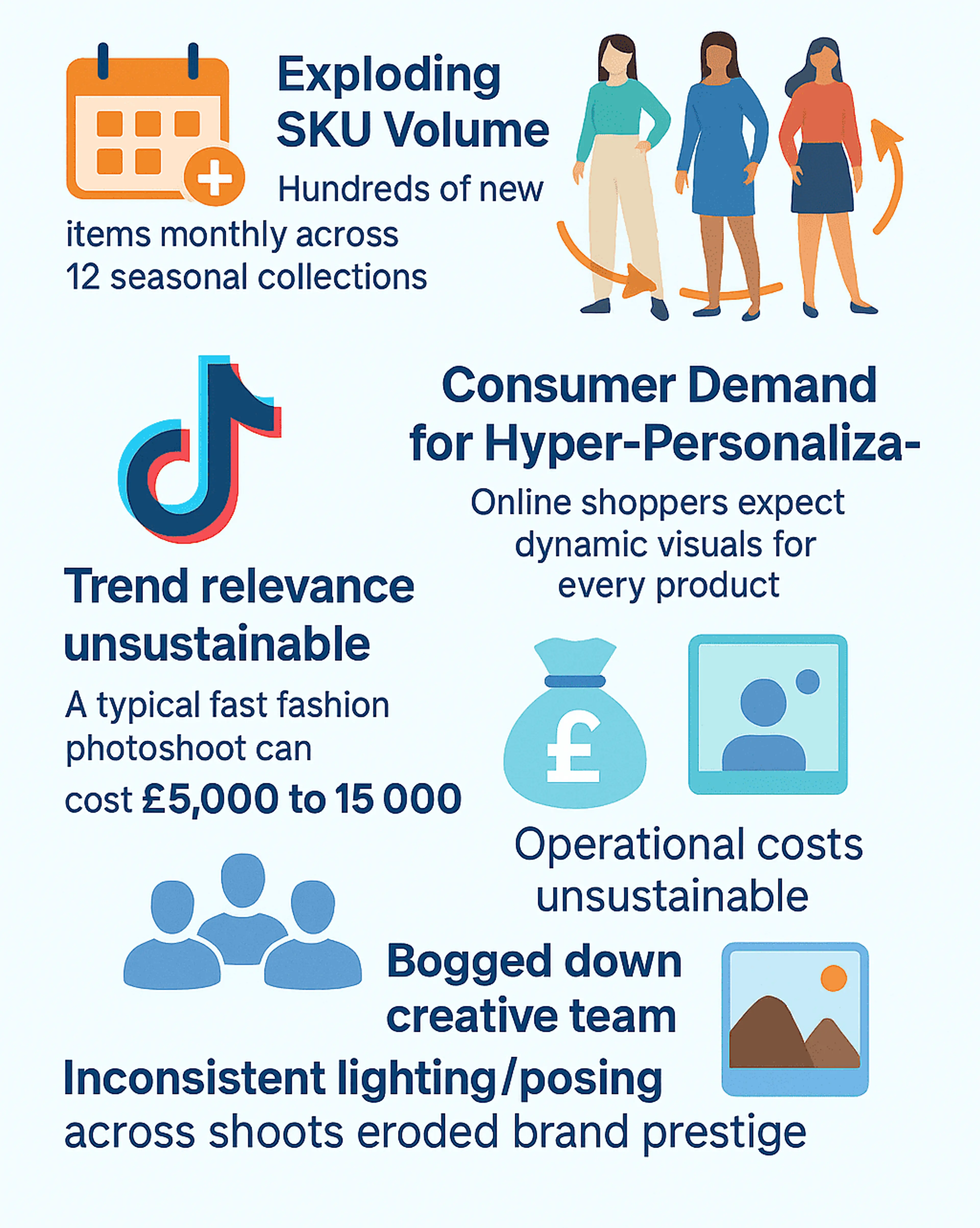 - Operational costs were unsustainable: A typical fast fashion photoshoot can cost anywhere from £5,000 to £15,000 (approximately $6,300 to $11,000), depending on the scope of the project and the level of creative direction involved.