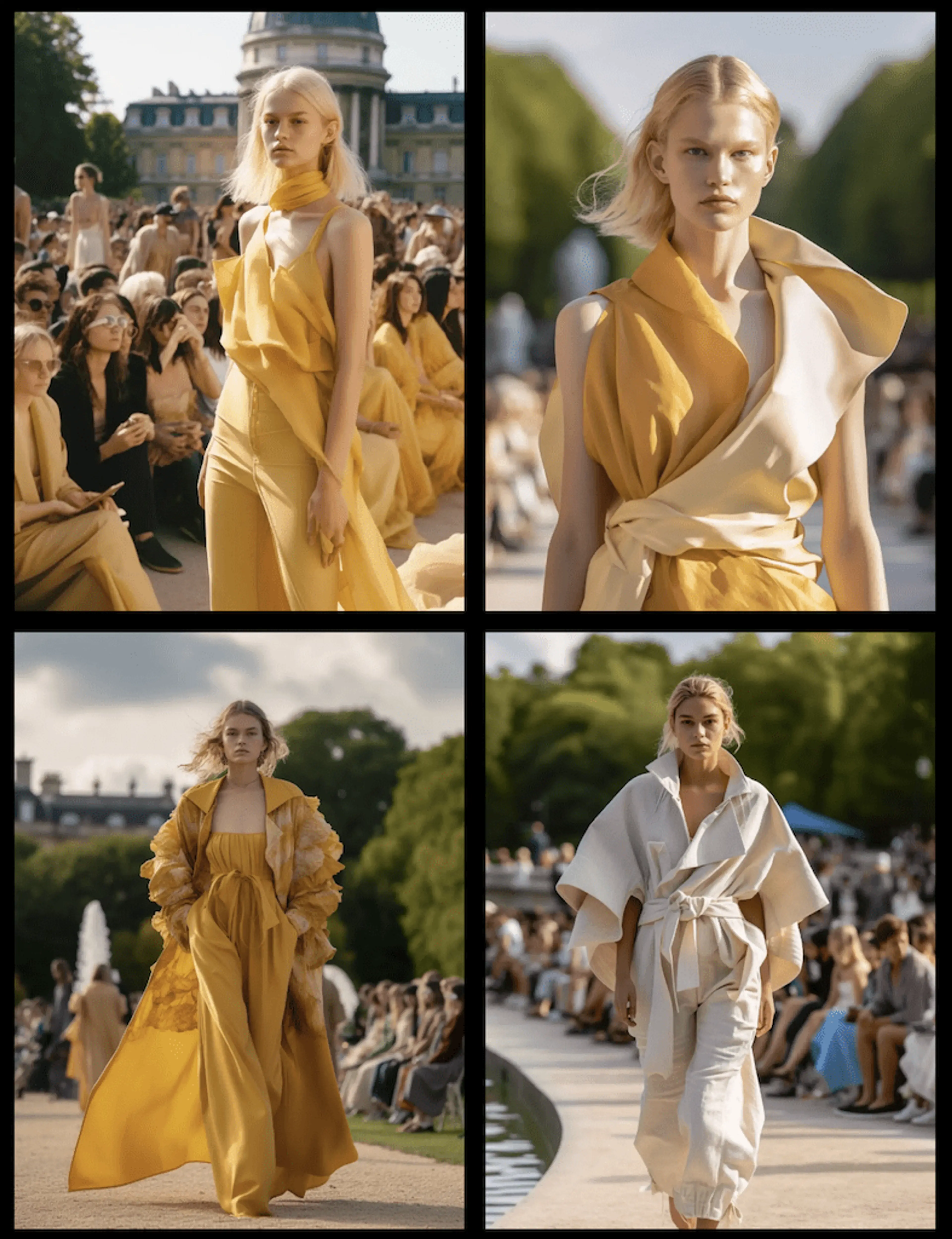 One standout example from AI Fashion Week was Matilde Mariano’s collection, which was entirely created using Midjourney, a widely recognized AI image generator. The collection featured highly realistic models set in an outdoor Tuileries garden, a setting known for its iconic connection to Parisian fashion. What made Mariano’s work unique was the seamless integration of AI technology, which allowed her to craft detailed, photorealistic images of models in the collection’s pieces – without any physical photoshoots.