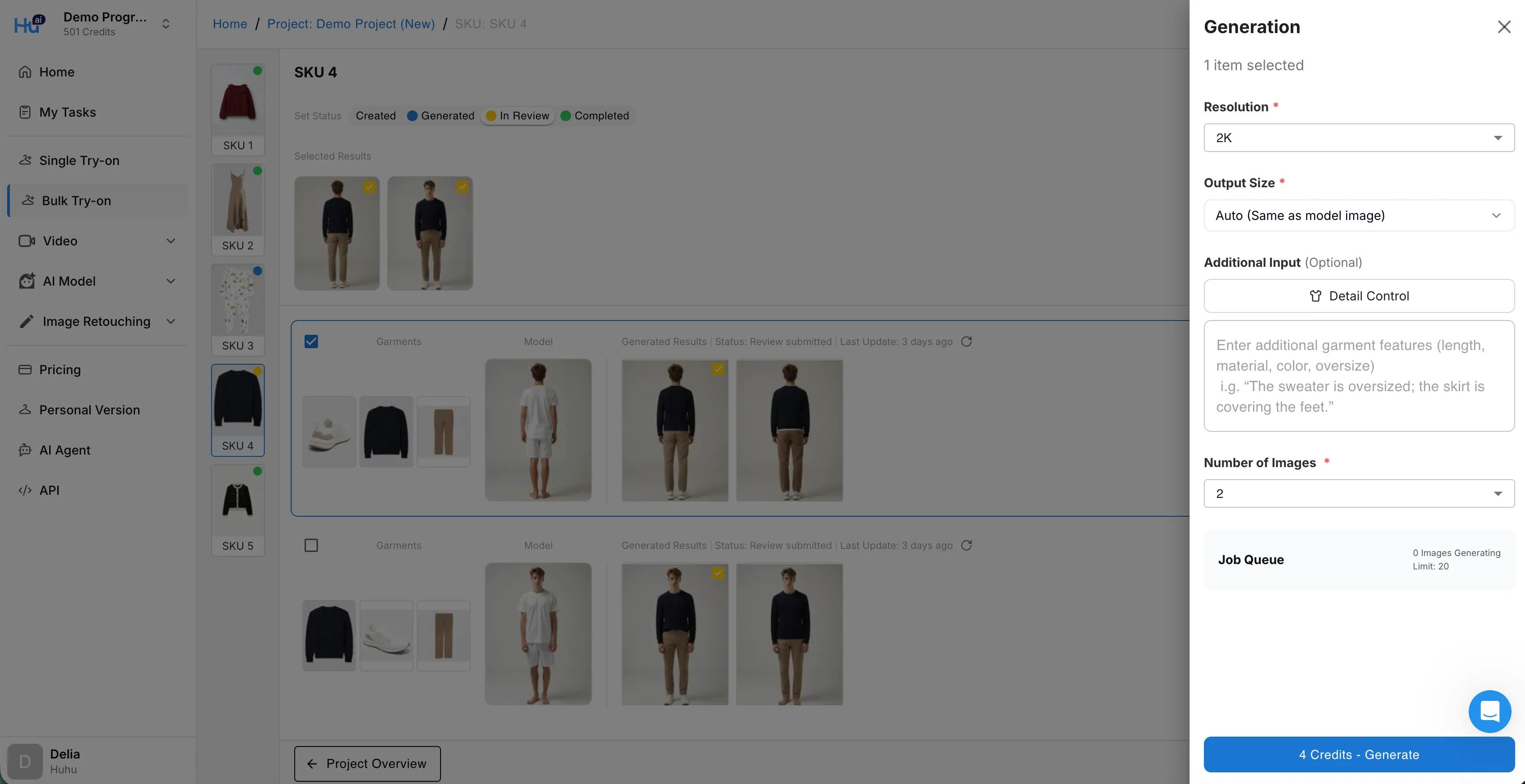 When all missing pairings are fixed, you can check all the tasks you’d like to generate and click the Generate try-on button to start the generation.