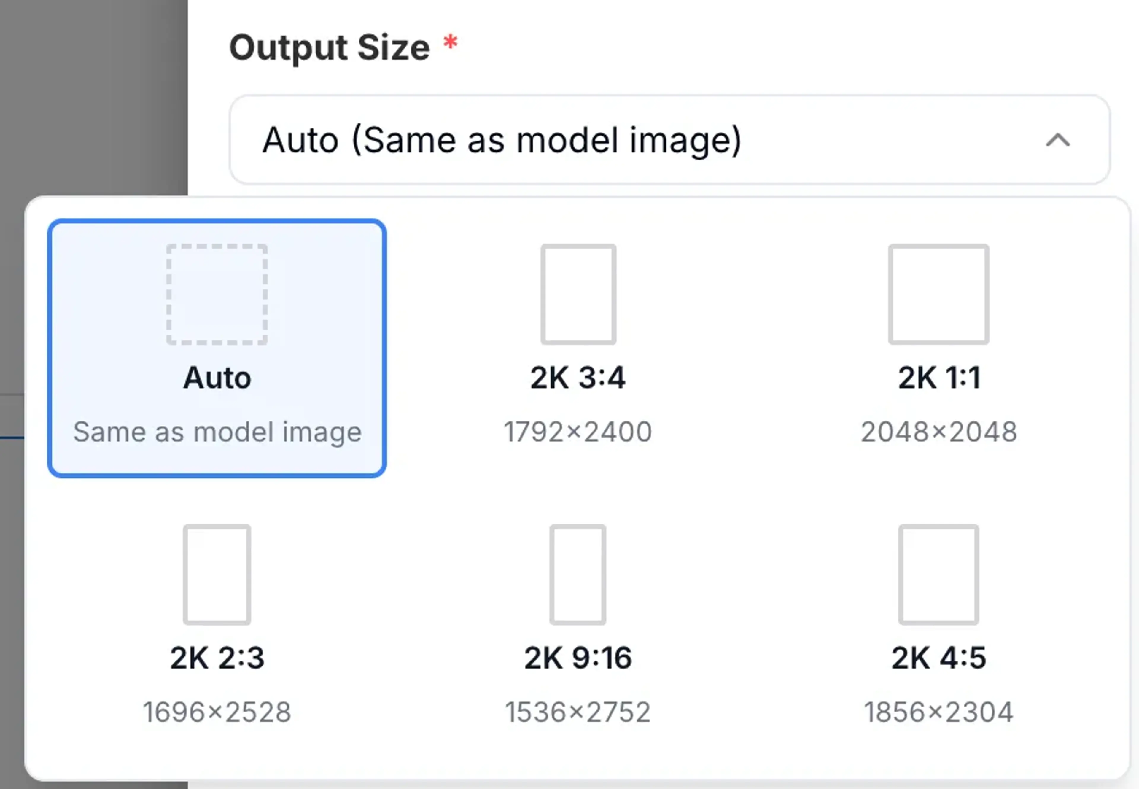 Aspect ratio options: Auto (Same as model image), 3:4, 1:1, 2:3, 4:5, 9:16