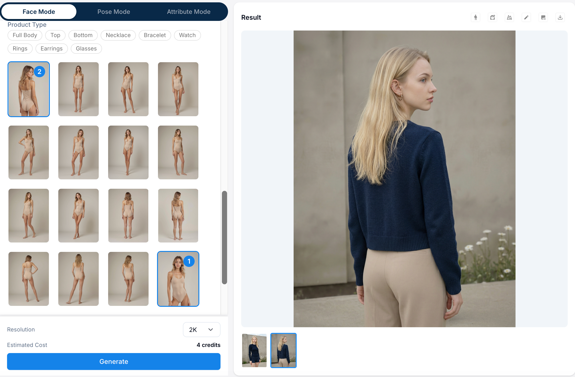 Multi select the poses you need for your model images. You can deselect the pose you don’t need or click the edit button to update the prompt for the poses you want.