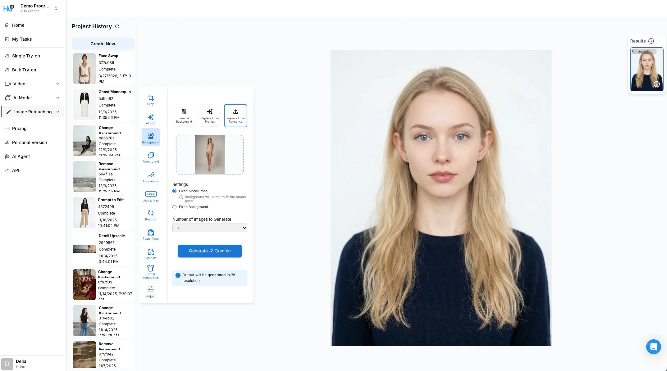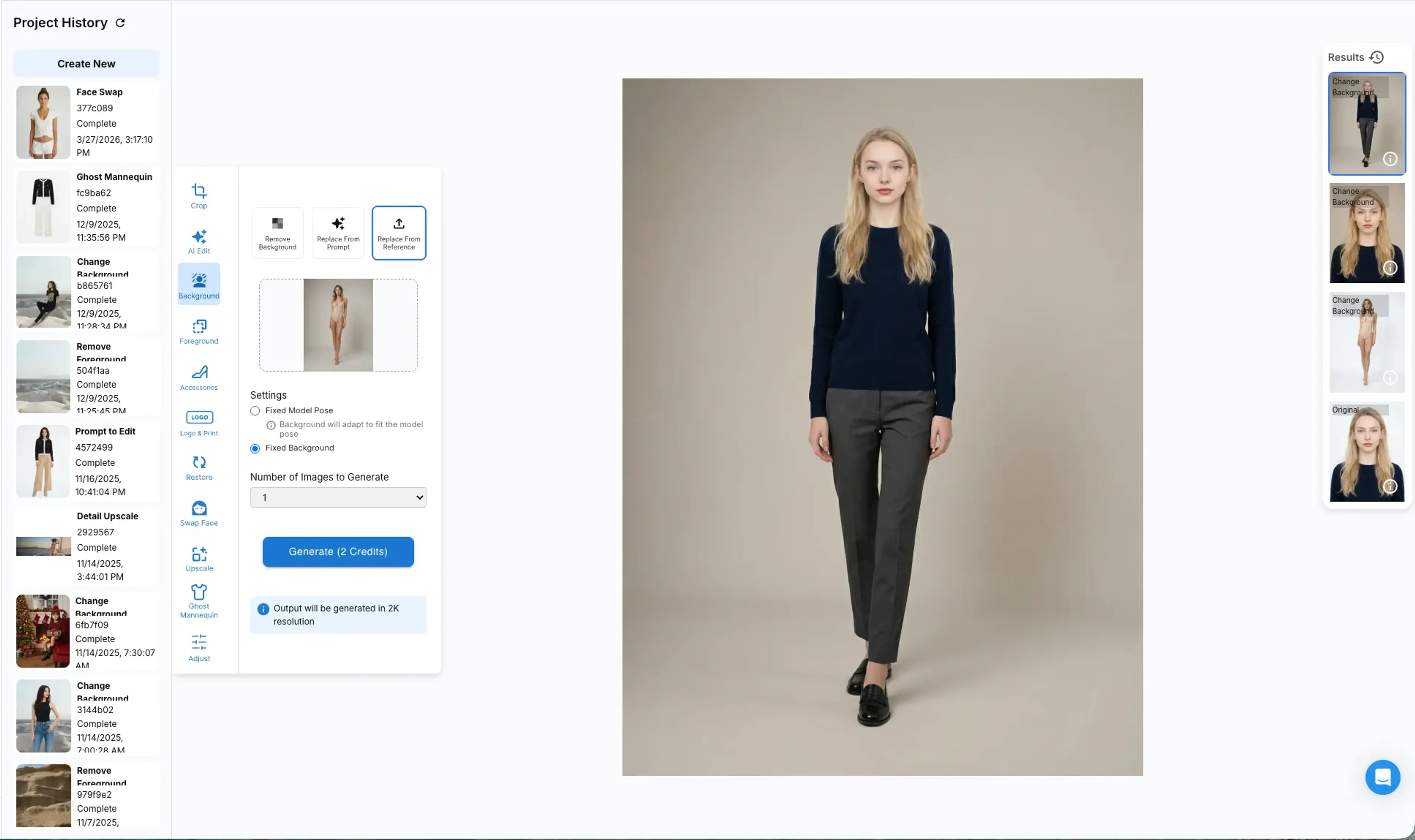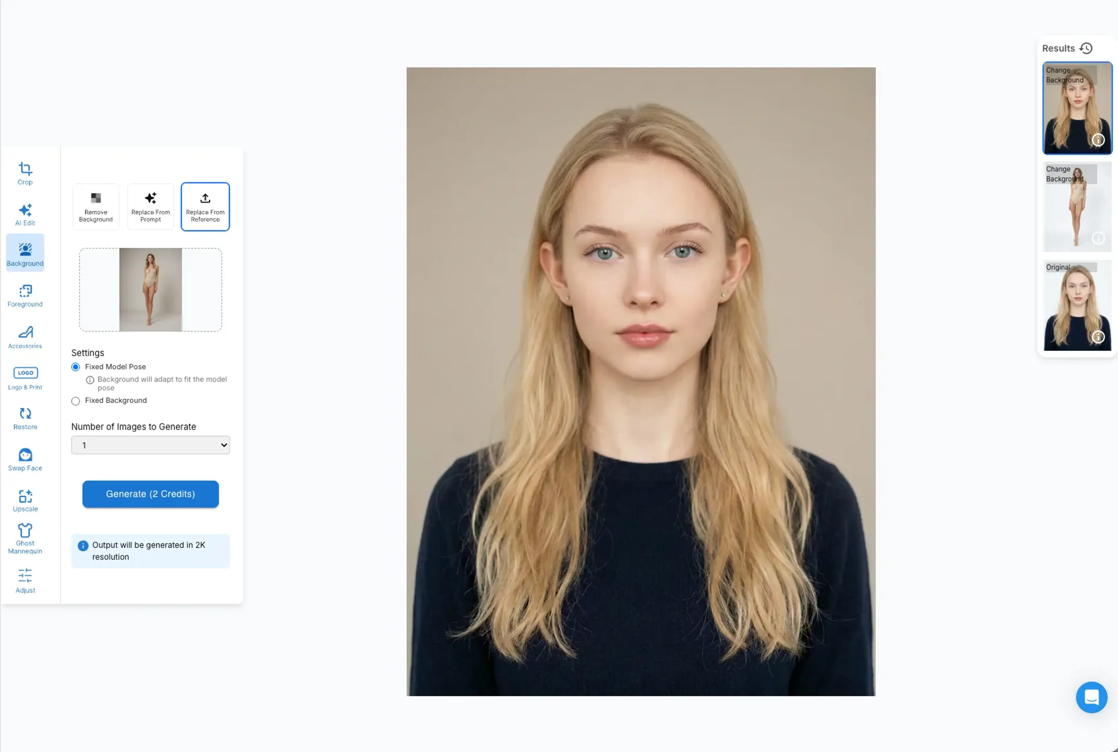 If you already have a model image with the pose and look you like, and you simply want to change the background scene of the model image, you can use the change background feature under the Image Retouching tool.