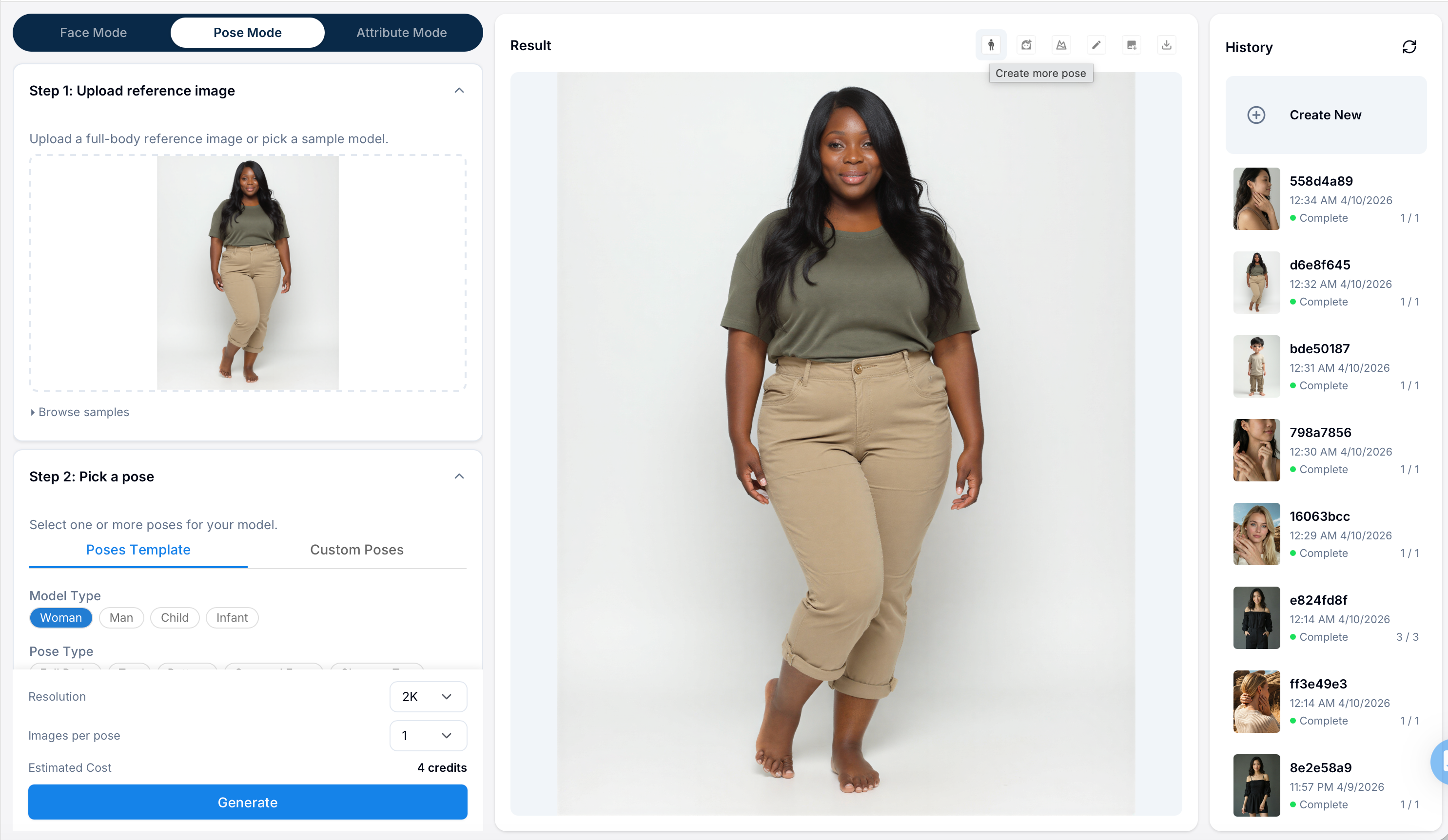 You can continue creating more poses from the model image, or use this model as face reference or background scene reference.