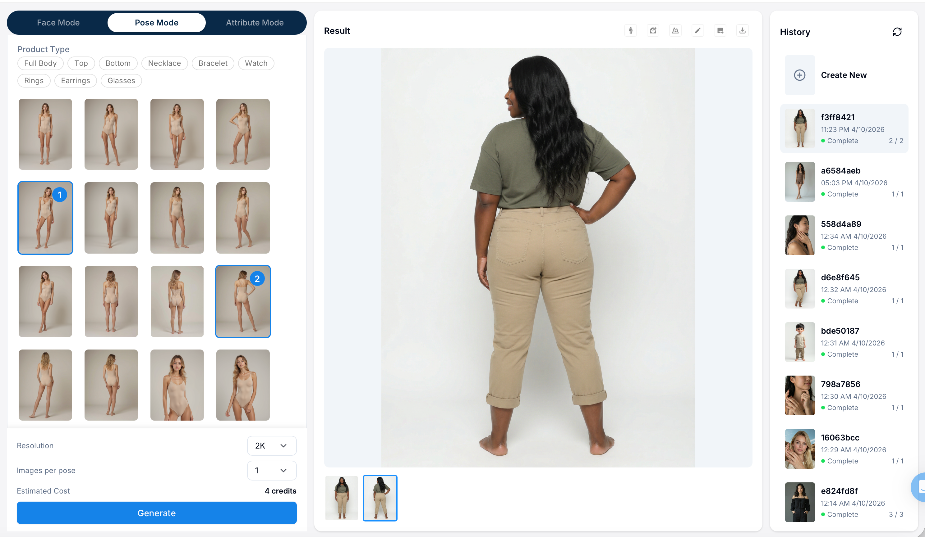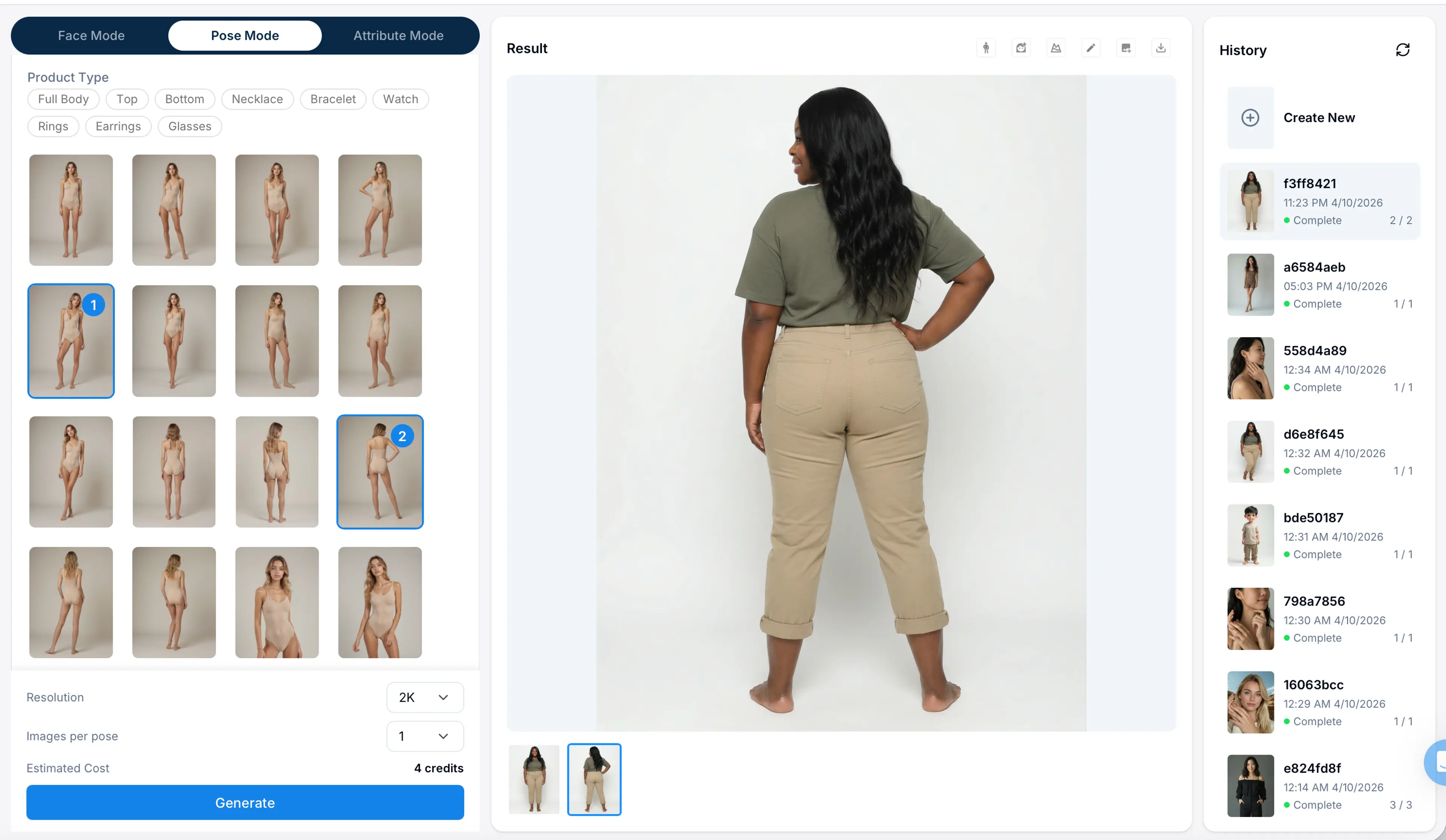 Users can fully customize AI fashion models using the model generator feature, choosing body shape, skin tone, hairstyle, facial features, or uploading reference photos.