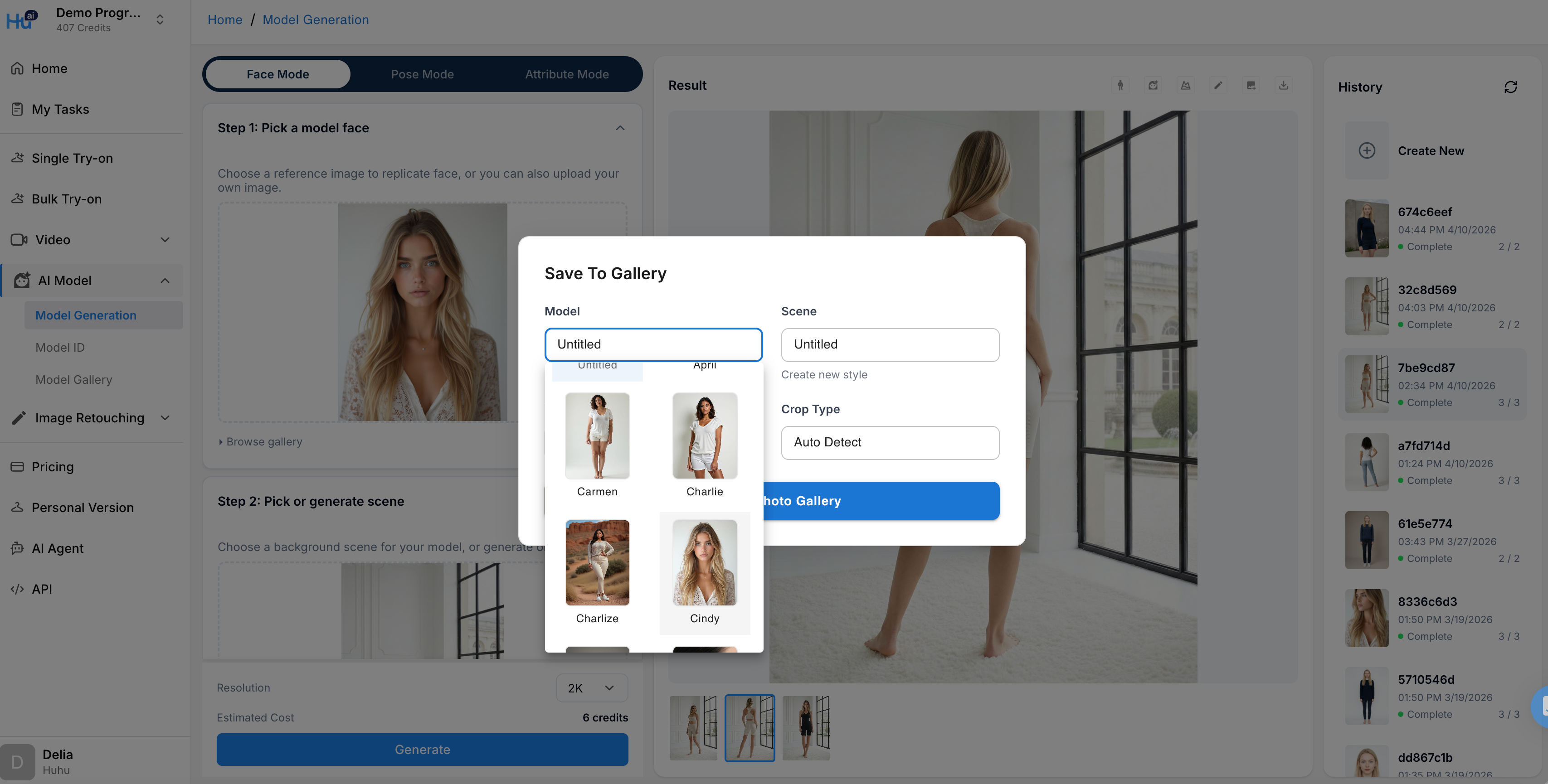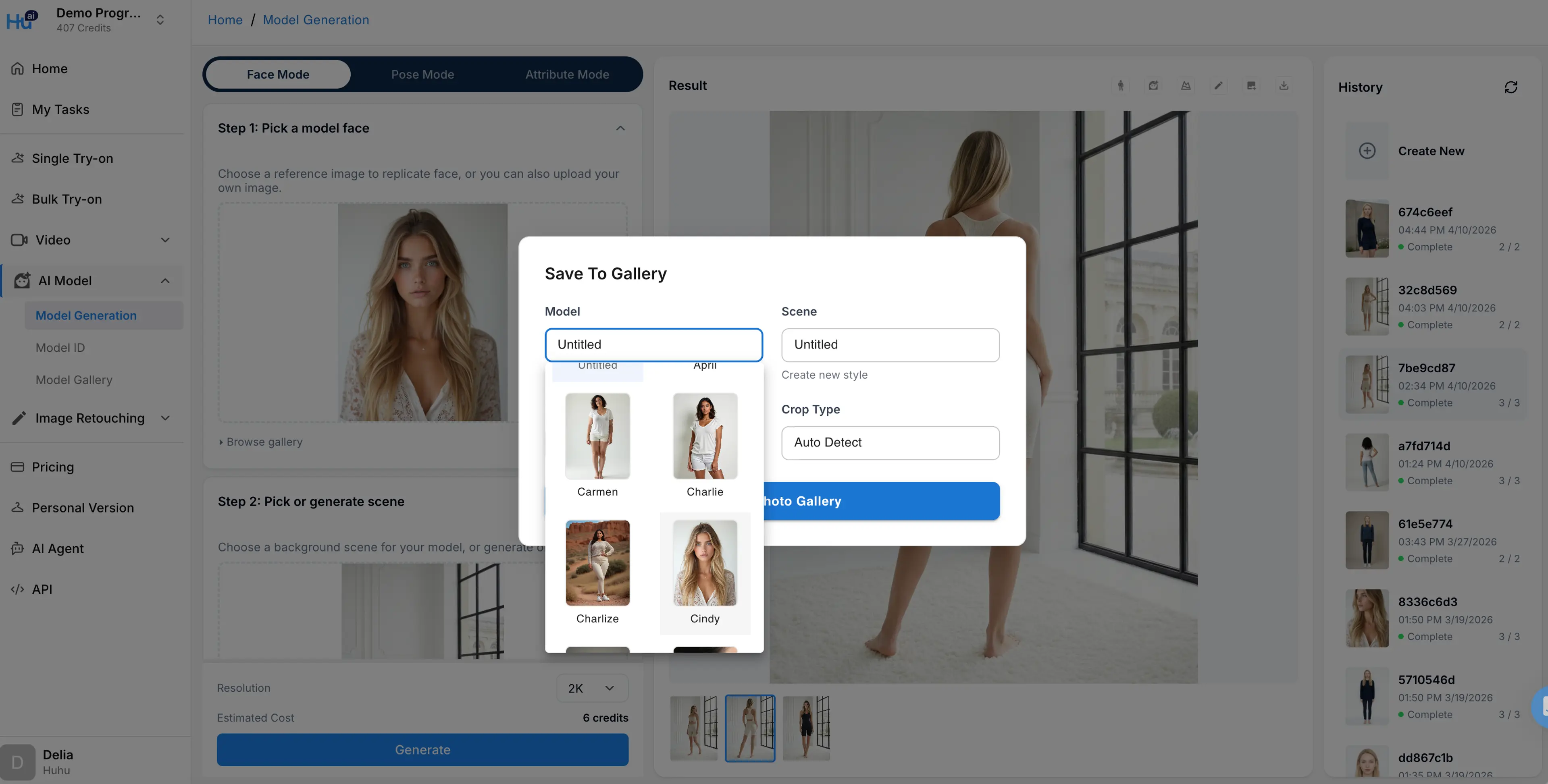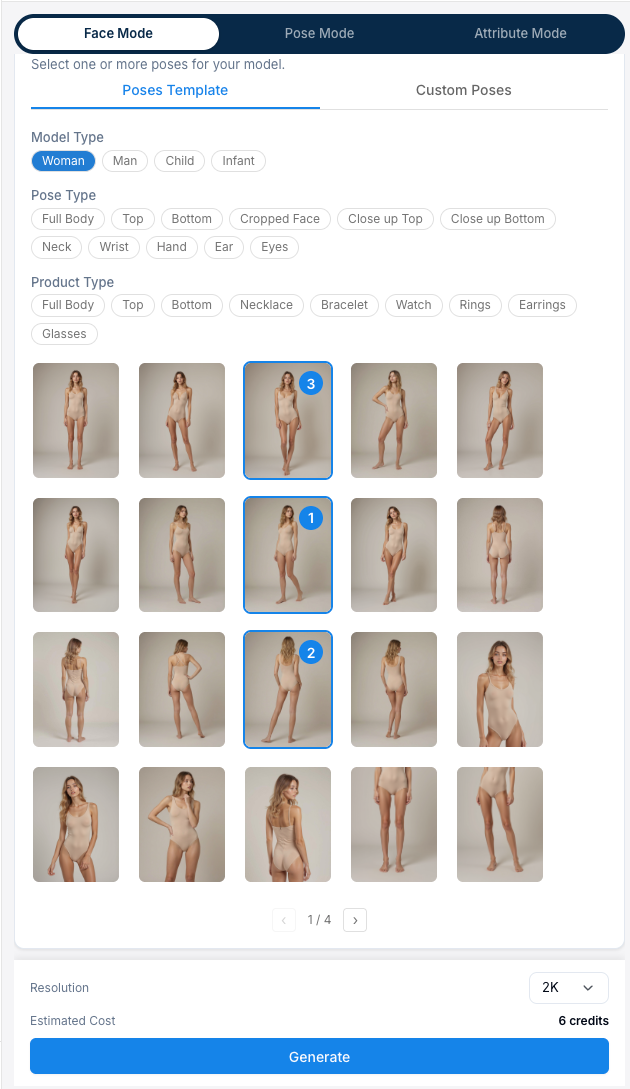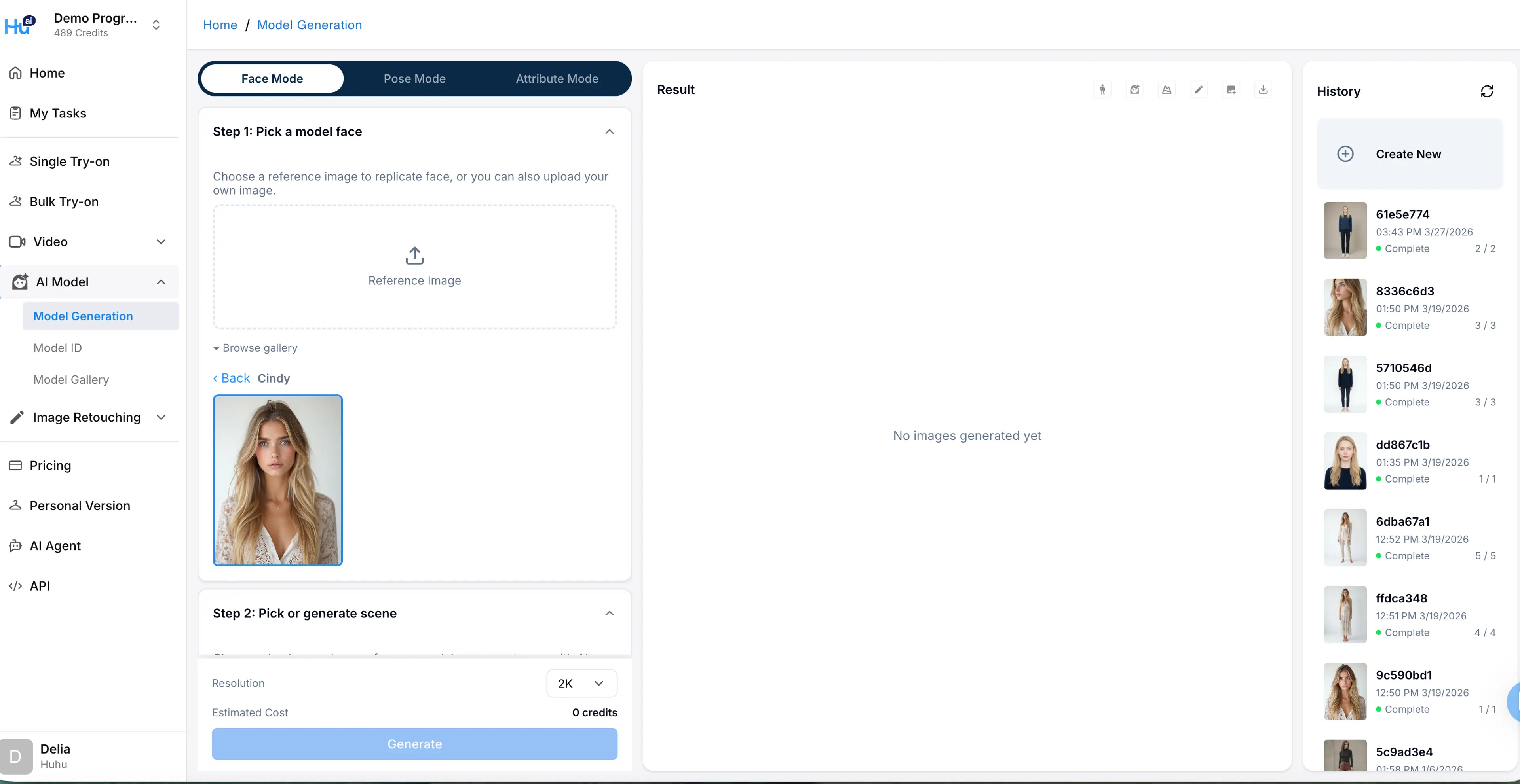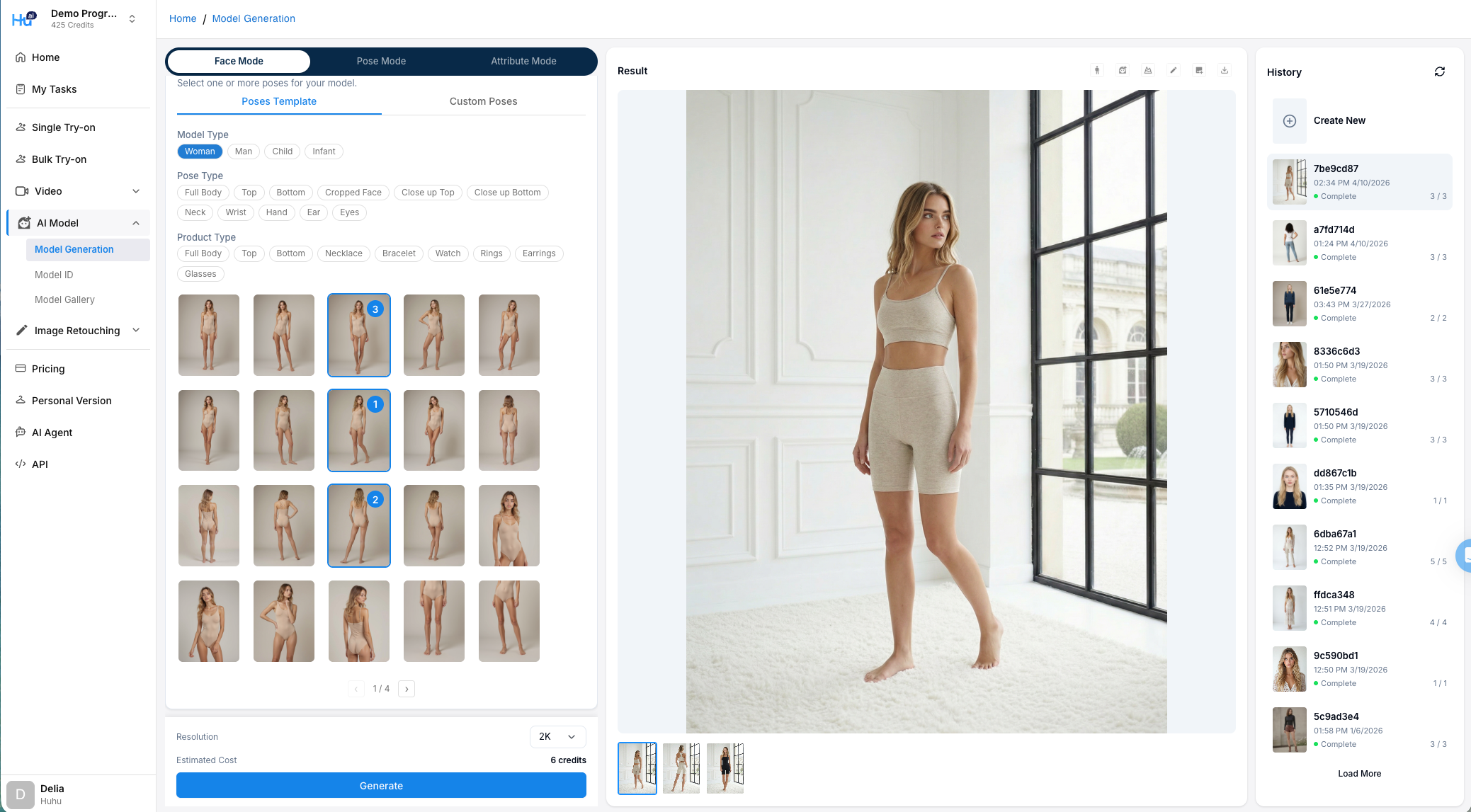 You have the option to select between 2K or 4K resolution. The model images by default will be generated in 3:4 ratio. Your task will also enter as a job card in the History section on the right. You can exit this page and come back to click the job card when the results are completed.