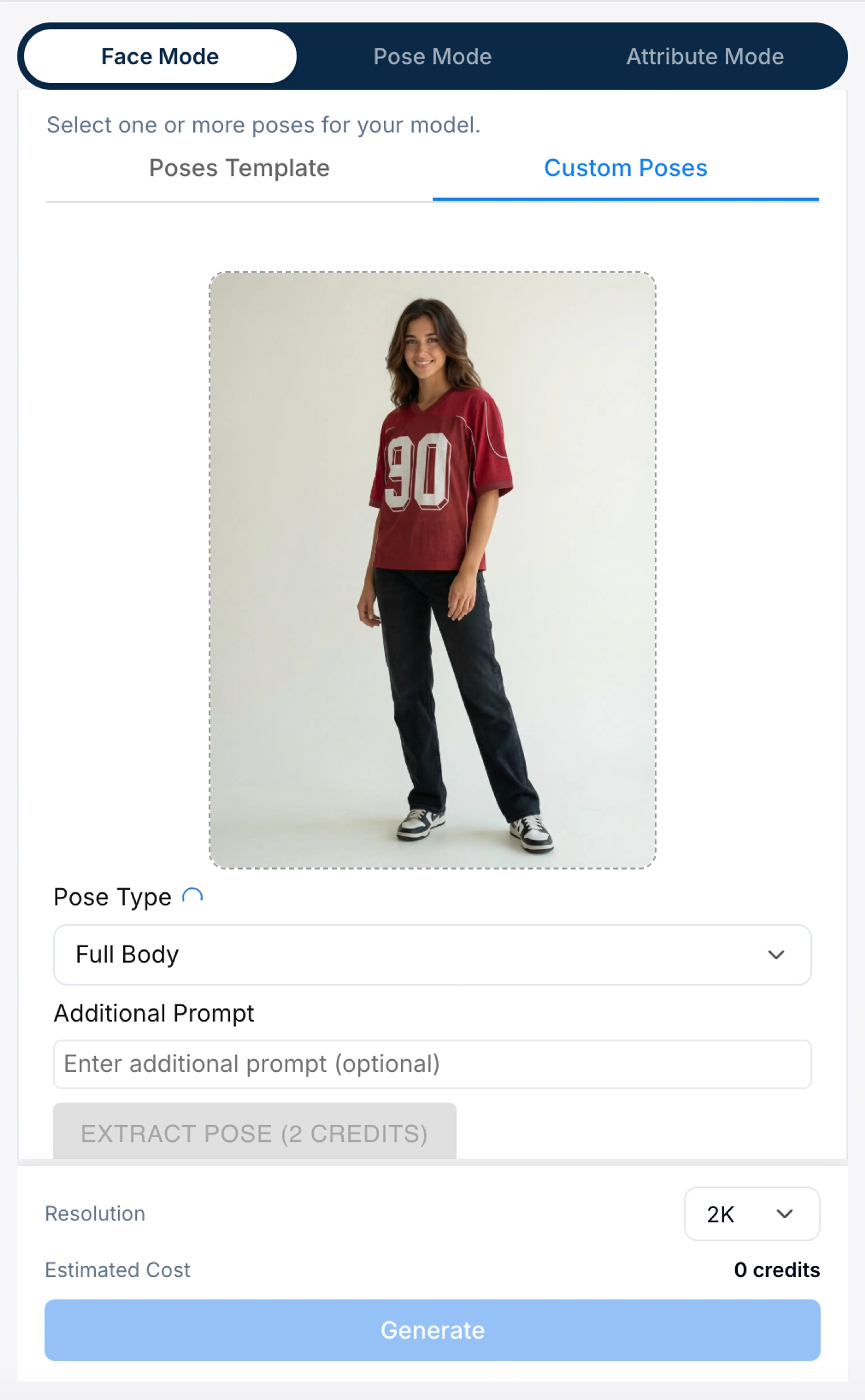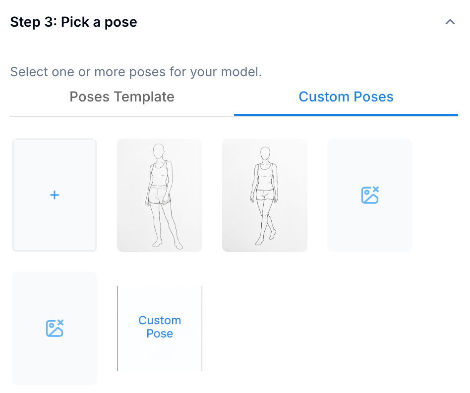 Navigate to the Custom Pose tab next to the Post template tab. Click the + icon to enter the custom pose creation flow. You will be prompted to upload the pose reference image you like. The system will automatically detect the pose type that fit your reference image.