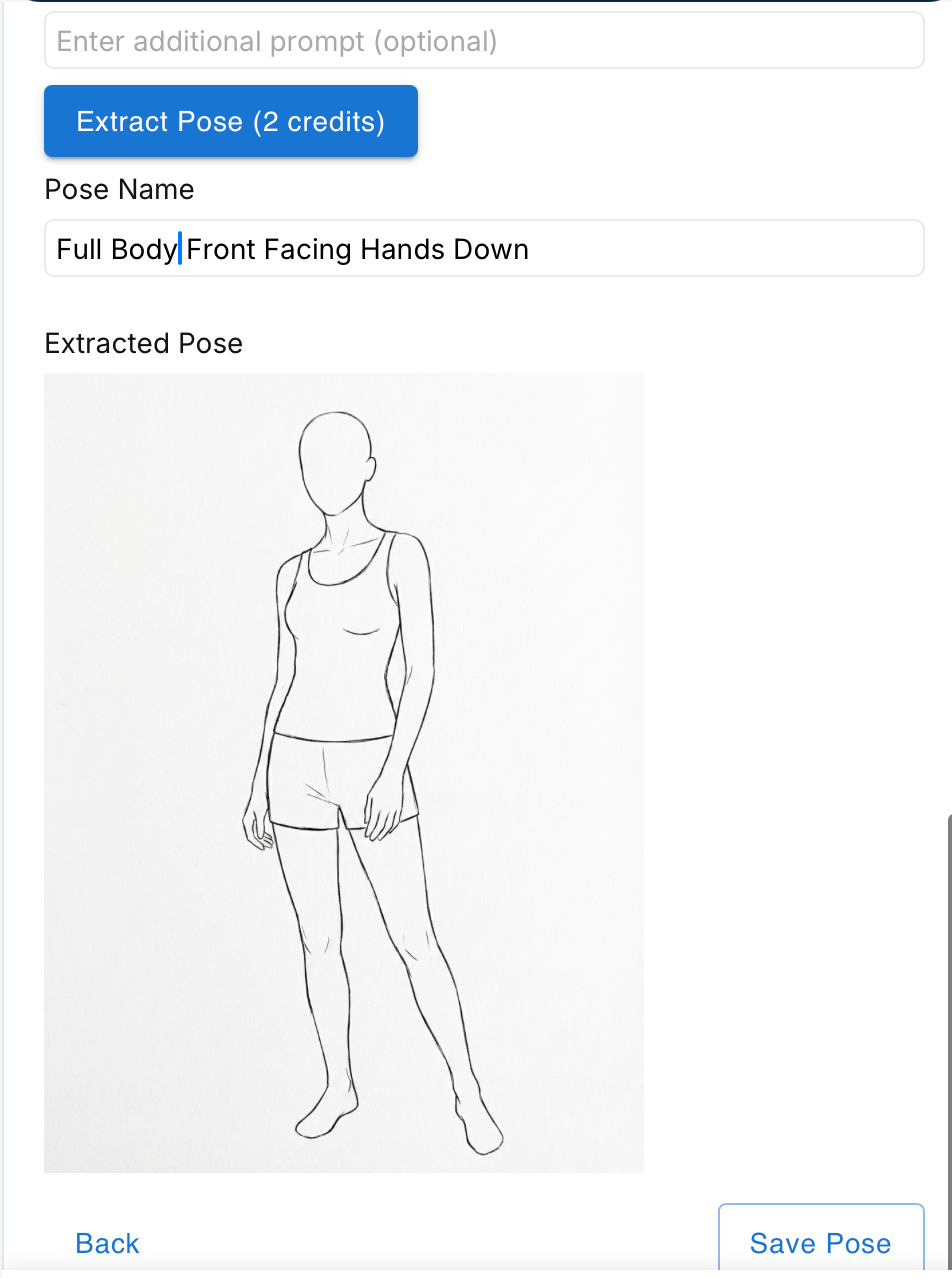 Click the Extract Pose button to extract the pose. This operation will generates a sketch pose that removes all the detail of the figure and only keeps the pose. If you are satisfied with the extracted sketch image, you can save this pose. If you are not satisfied you can extract the pose again. Please note: each extraction will cost 2 credits.