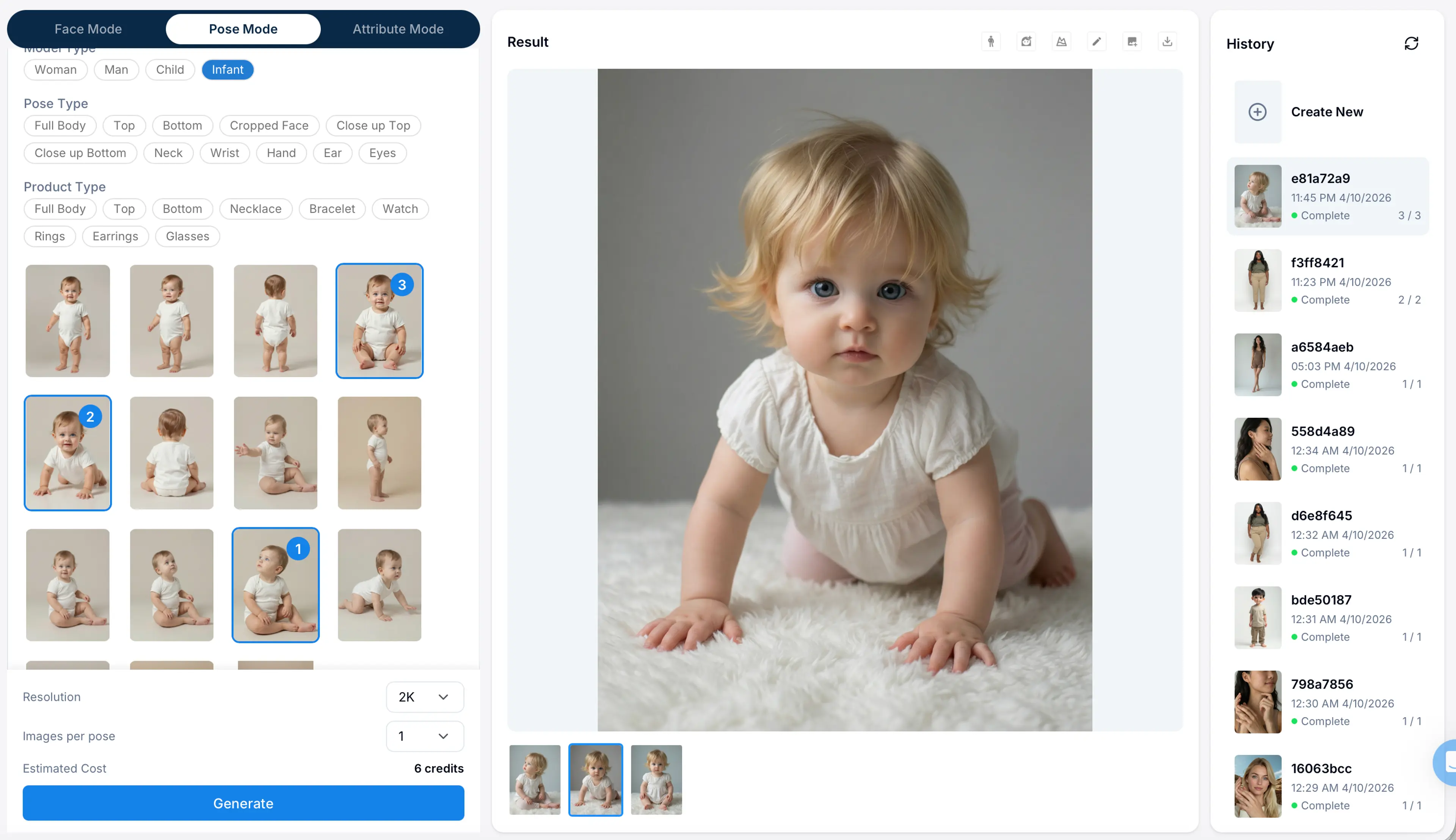 For example, you can click into a Face mode job result, and on the tool bar on top, click the Create more poses button. This operation will enter the selected image into the Pose Mode reference image. Then you can select poses from the templates.