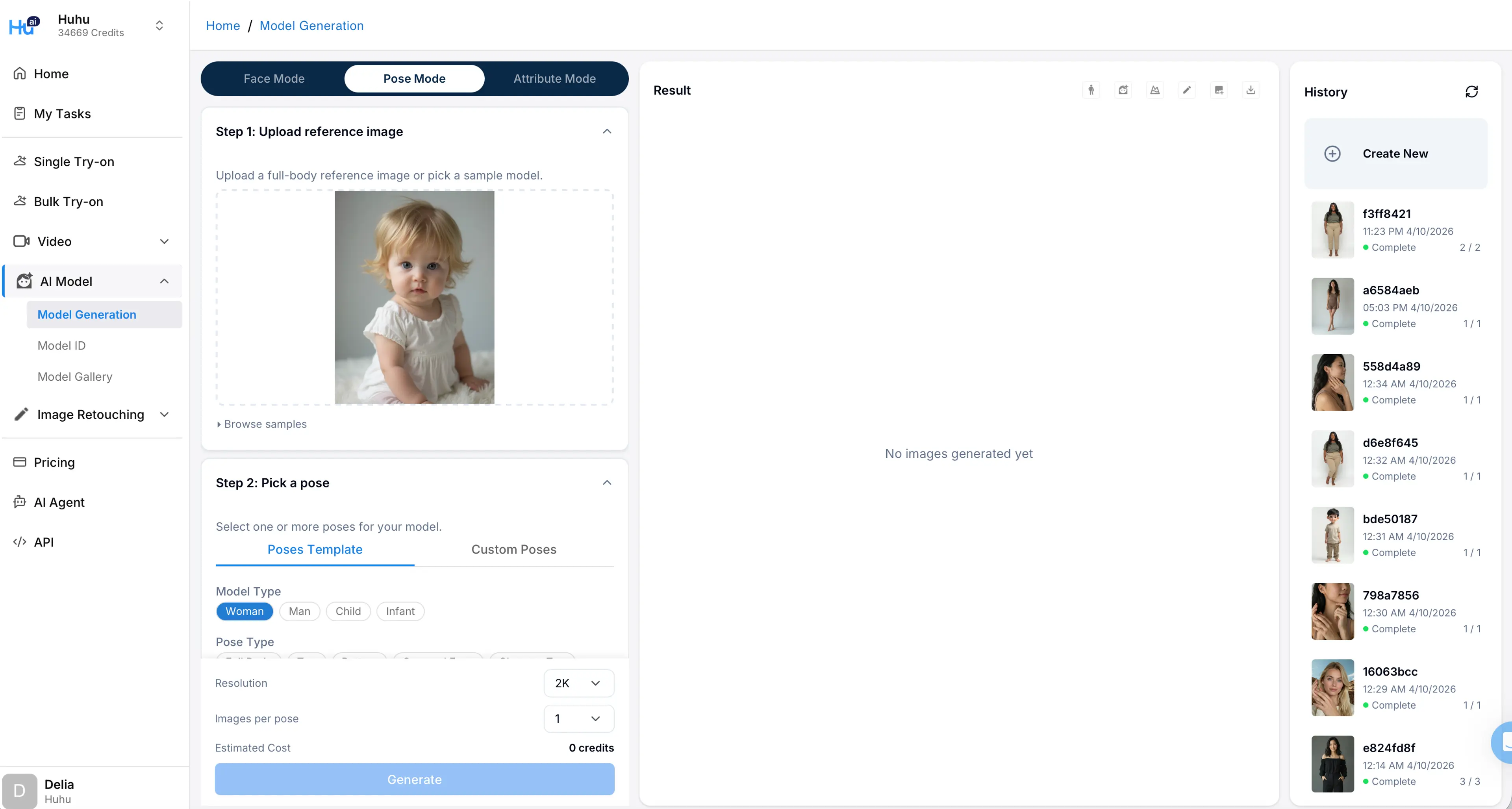 Learn how to generate AI model images using face references in HuHu AI Studio, including uploading faces, adding background references, and customizing attributes.